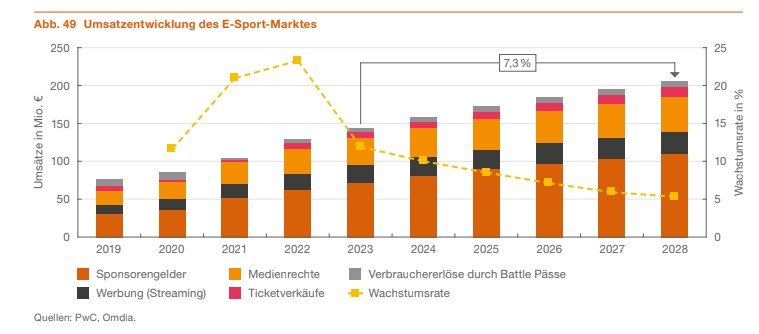 - Wachstumsraten: Die Branche weist jährlich hochprozentige Wachsumtsraten auf, was sie zu einem der dynamischsten Märkte macht. Die Beratungsagentur PwC rechnet Im «German Entertainment & Media Outlook 2024-2028» gar mit einem jährlichen Wachstum von 9.5% – alleine für den deutschen Markt.